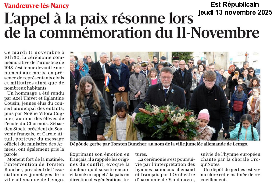 Lors des commémorations de l’armistice du 11 novembre, l’AAAHV, par l’intermédiaire de sa section Histoire, a pris part aux divers événements organisés à Vandoeuvre. Cette année, le jumelage de Vandoeuvre avec la ville allemande de Lemgo a été mis en avant, avec la présence d’une délégation de cette ville lors des commémorations.