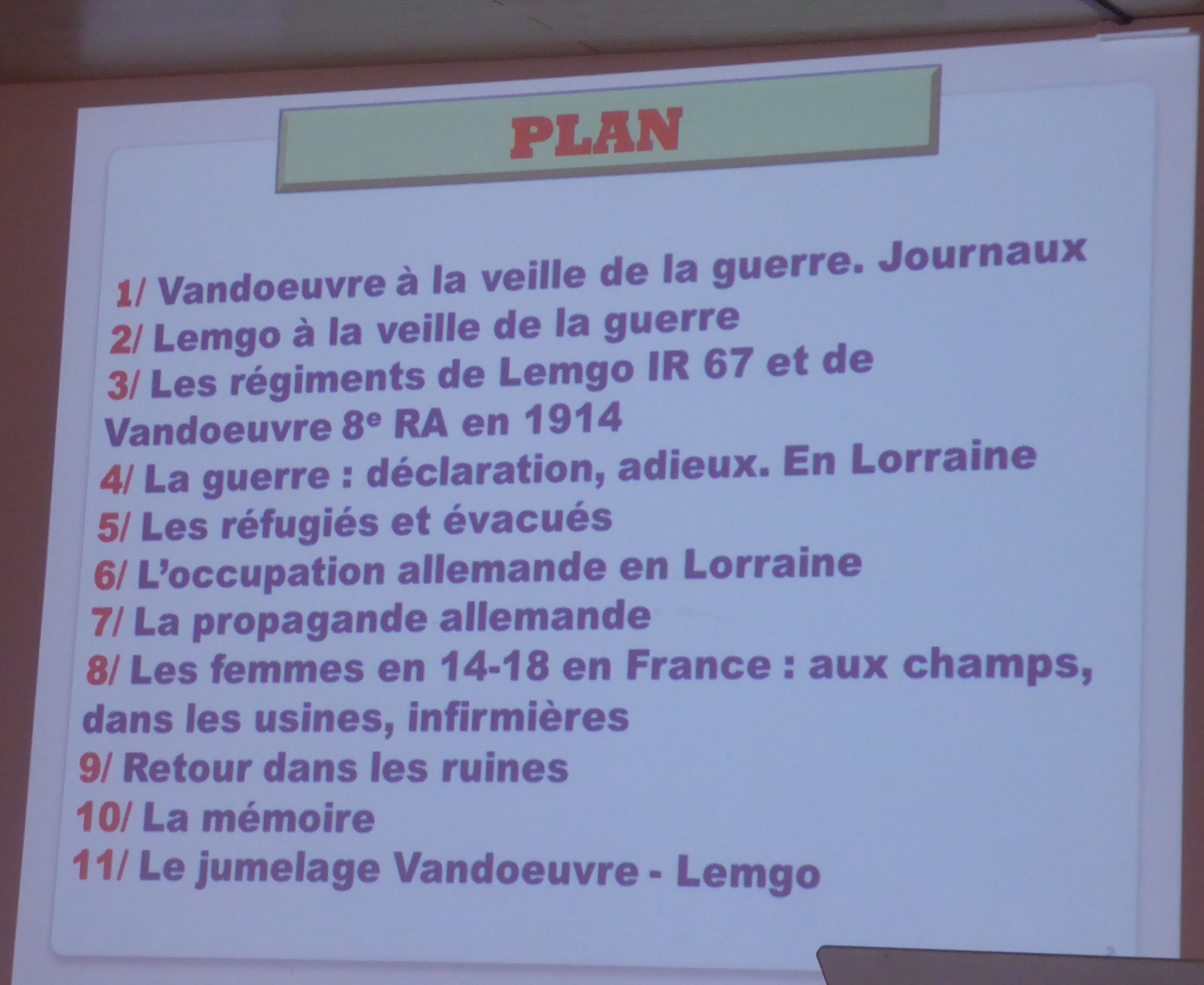 Présentée par Dominique Lacorde, et étayée par une riche documentation auprès des sources françaises et allemandes, cette conférence a permis de tracer un parallèle entre les situations de Vandoeuvre et de Lemgo dans la période 1914-1918. Chacun des points du plan ci-dessous a été développé, avec une traduction en allemand, afin de tenir compte de la présence dans le public des représentants de cette ville jumelle.