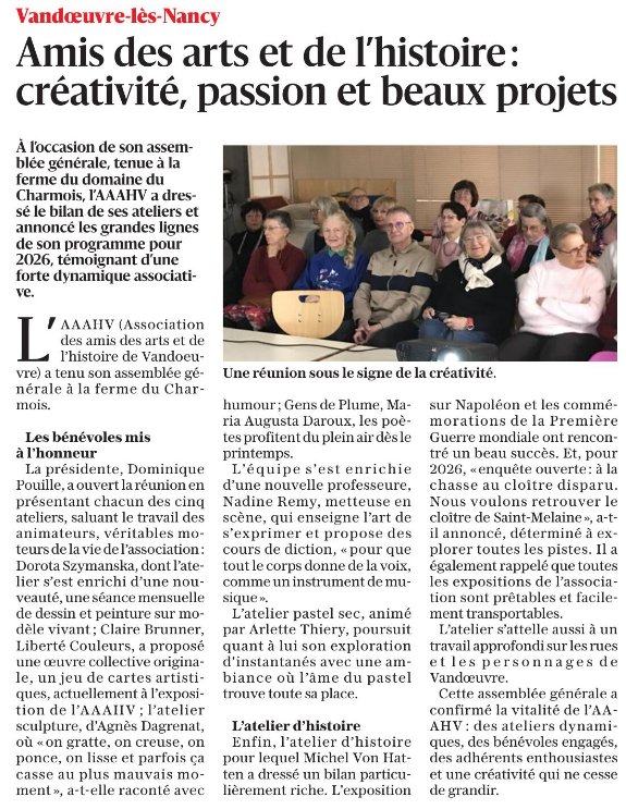 En présence du maire de Vandoeuvre, M. Patrice (Manu) Donati, du Conseiller municipal délégué aux Relations publiques M. Jean-Pierre Becker, de la journaliste de l’Est Républicain Mme Marie-Danièle Maix et des membres de l’AAAHV, l’Assemblée Générale Ordinaire 2024-2025 de l’association a eu lieu le 29 novembre dernier à la Salle Provençal de la Ferme du Charmois à Vandoeuvre, sous la direction de la présidente Mme Dominique Pouille.