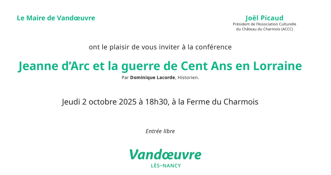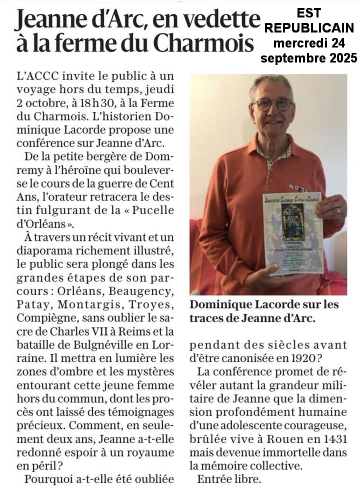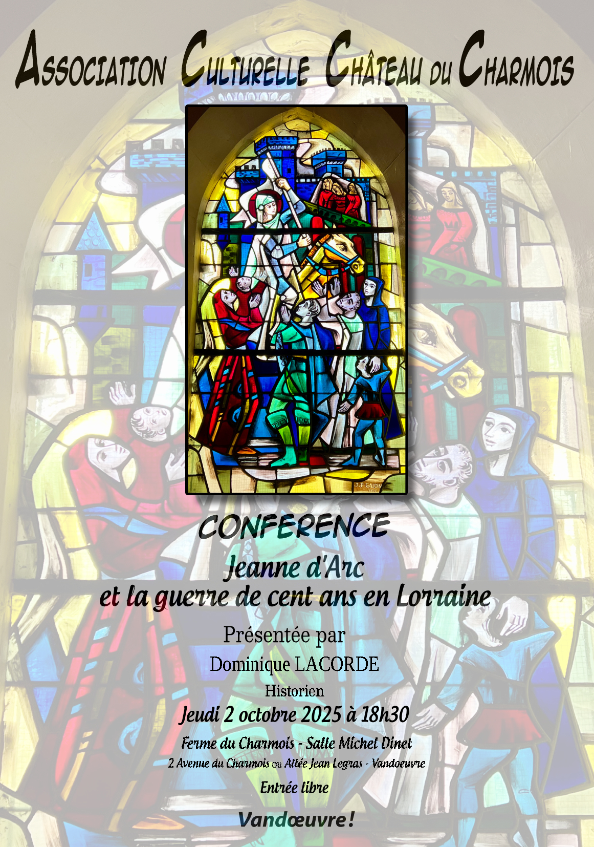 Michèle Donati, vice-présidente de l’AAAHV et sécretaire de l’ACCC (Association Culturelle du Château du Charmois), nous fait parvenir l’invitation à la conférence « Jeanne d’Arc et la guerre de cent ans en Lorraine » , qui sera présentée par Dominique Lacorde :