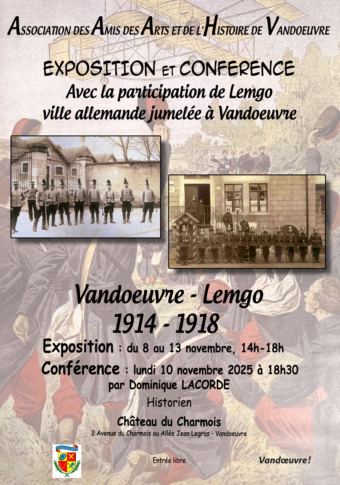 À l’occasion du 11 novembre 2025, une exposition commune aux deux villes sera présentée au château du Charmois avec une conférence le lundi 10 novembre 2025 qui complétera cette exposition riche de nombreux documents sur les deux cités à l’époque de la Grande Guerre : Vandoeuvre et Lemgo à la veille de la Première Guerre Mondiale, les préparatifs de la guerre, la vie des habitants de 1914 à 1918, la vie associative et festive, la vie militaire, la garnison de Lemgo en particulier le 67e régiment d’infanterie (IR67) avec ses nombreuses recrues locales, la vie économique, les écoles et la jeunesse, les hôpitaux et les infirmières, le travail des femmes, les cultures mémorielles et les témoignages après la guerre. La conférence sera illustrée par un diaporama avec de nombreux documents qui compléteront l’exposition et des documents sur la vie des civils et en particulier le rôle des femmes durant la Grande Guerre.